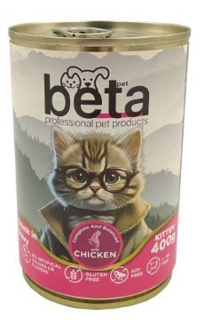 Beta Kedi Konservesi Yavru Tavuklu 400gr Yavru kediler için özenle formüleedilmiş, deri tüy kalitesini arttıran, dengeli aminoasit, vitamin vemineralleri içeren, püre şeklinde tavuk etli komple konserve yavru kedi mamasıdır.