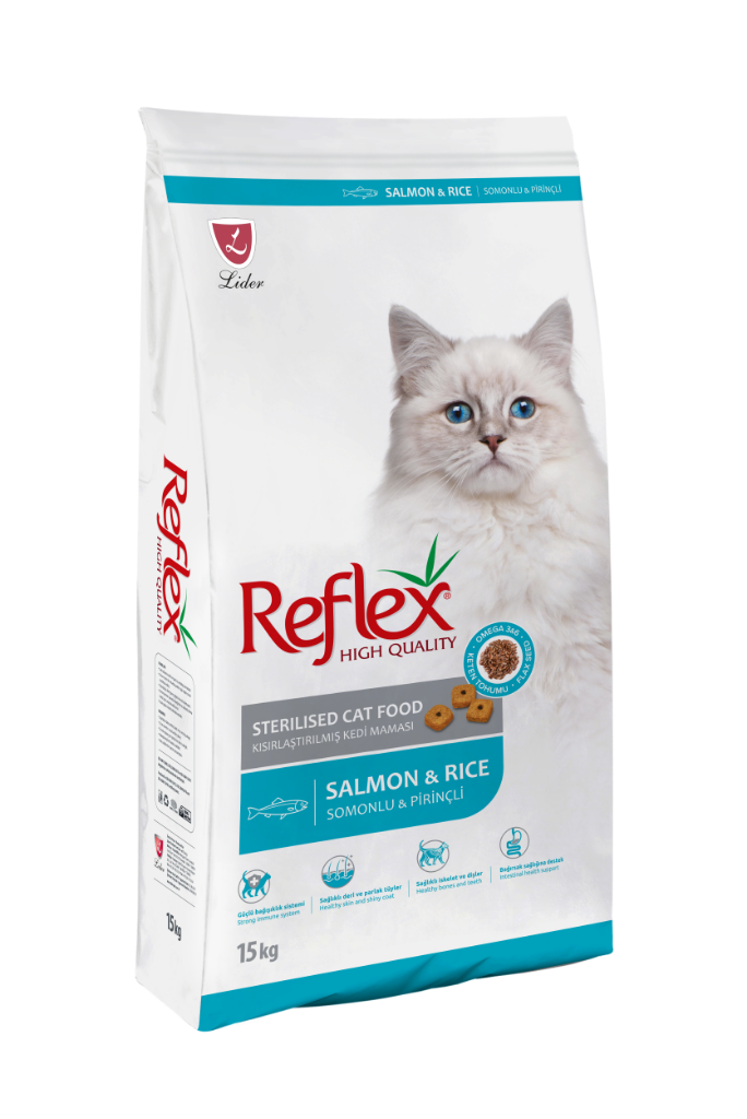 Reflex Somonlu Kısırlaştırılmış Kedi Maması 15kg Kısırlaştırılmış kediler için özenle hazırlanan formülüyle Reflex Sterilised tam bir vitamin deposudur. Formülünde bulunan vitamin ve mineralların kusursuz dağılımı sayesinde kısırlaştırılmış kedilerin günlük enerji ihtiyaçları tam olarak karşılanır ve vücutlarının hayati öneme sahip bağışıklık sistemleri desteklenir. Kolay sindirilebilir özellikte olan Reflex Sterilised yüksek protein ve düşük yağ oranıyla üretilmektedir. Tüy ve deri sağlığını korumak için formülünde bira mayası bulunmaktadır. İçerik Mos (Mannan Oligo Sakkarit) Hayvansal Yağ Yuka Buğday Pirinç Kurutulmuş Şeker Pancarı Beta-Glukan Balık Yağı Taurin Mısır Tuz Balık Unu Mısır Gluteni Kuru Bira Mayası Ciğer Aroması İşlenmiş Hayvansal Protein Kuilaya Balık Aroması Keten Tohumu Mos (Mannan Oligo Sakkarit) Hayvansal Yağ Yuka Buğday Pirinç Kurutulmuş Şeker Pancarı Beta-Glukan Balık Yağı Taurin Mısır Tuz Balık Unu Mısır Gluteni Kuru Bira Mayası Ciğer Aroması İşlenmiş Hayvansal Protein Kuilaya. Balık Aroması Keten Tohumu Çinko Bakır Demir Kalsiyum Sodyum Selenyum İyot Fosfor Potasyum Klorür Vitamin A Vitamin K Vitamin D Kolin Vitamin. B1 - B2 - B3 (Niasin) - B6 - B12 - B7 (Biotin) - B9 (Folik Asit) Vitamin C Kalsiyum Pantotetan Vitamin E Analiz Tablosu Sodyum: %1,2 Bakir Sülfat: 18 mg/kg Vitamin A: 18000 IU/kg Vitamin D3: 1500 IU/kg Vitamin E: 200 mg/kg Vitamin C: 400 mg/kg Taurin: 1500 mg/kg ME (Metabolize Olabilir Enerji): 3448 kcal/kg Ham Protein: %33 Ham Yağ: %13 Ham Selüloz: %5 İnorganik Madde: %8 HCI'de Çözünmeyen Kül: %8 Nem: %10 Kalsiyum: %1,5 Fosfor: %1 Besin Katkı Maddeleri A Vitamini 18000UI D3 Vitamini 1500UI E Vitamini 200mg C Vitamini 400mg B2 Vitamini 200mg B6 Vitamini 200mg B1 Vitamini 200mg H Vitamini 1.5mg Folik asit 1.5mg B12 Vitamini 200mg Kolin klorür 3500mg Beta-karoten 1.5mg DL-metiyonin 2500mg Taurin 1500mg L-karnitin 300mg Besleme Rehberi 2-3kg kediler için günlük 35gr-55gr arası 4-5kg kediler için günlük 75gr-90gr arası Beslenme seviyeleri genel bilgi özelliği taşımaktadır. Evcil hayvanınızın hareketlilik ve yaşına göre ayarlama yapılması önerilir. Ürün ambalajında tam besleme rehberini bulabilirsiniz.