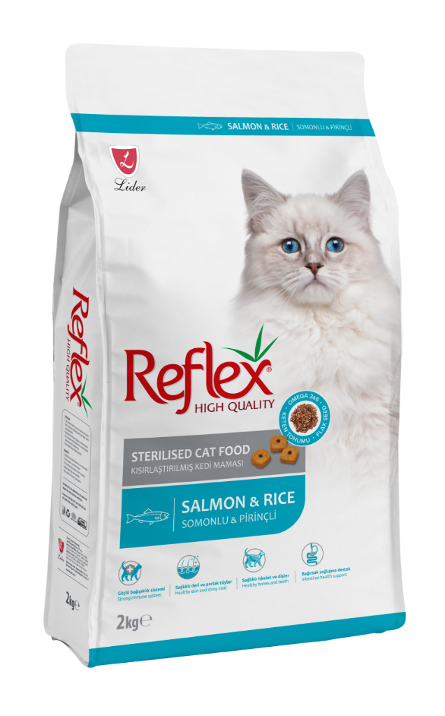 Reflex Somonlu ve Pirinçli Kısırlaştırılmış Kedi Maması 2kg Kısırlaştırılmış kediler için özenle hazırlanan formülüyle Reflex Sterilised tam bir vitamin deposudur. Formülünde bulunan vitamin ve mineralların kusursuz dağılımı sayesinde kısırlaştırılmış kedilerin günlük enerji ihtiyaçları tam olarak karşılanır ve vücutlarının hayati öneme sahip bağışıklık sistemleri desteklenir. Kolay sindirilebilir özellikte olan Reflex Sterilised yüksek protein ve düşük yağ oranıyla üretilmektedir. Tüy ve deri sağlığını korumak için formülünde bira mayası bulunmaktadır. İçerik Kurutulmuş Hayvan Proteini Tahıllar Mısır Pirinç Tavuk Yağı Kurutulmuş Somon Proteini Kurutulmuş Hamsi Proteini Mısır Gluteni Kurutulmuş Şeker Pancarı Buğday Kepeği Balık Aroması Somon Yağı Hamsi Yağı Vitaminler ve Mineraller Keten Tohumu Bira Mayası Tuz Taurin MOS Yucca Schidigera Koruyucular Antioksidanlar Analiz Raporu Ham Protein %33 Yağ İçeriği %13 Ham Selüloz %5 Ham Kül %8 Besin Katkı Maddeleri A Vitamini 18000 UI/kg D3 Vitamini 1500 UI/kg E Vitamini 200 mg/kg C Vitamini 400 mg/kg Vitamin B1-B2-B3-B6-B12-B7-B9 Vitamin K3 200 mg/kg Taurin 1500 mg/kg Metiyonin 2500 mg/kg Demir 200 mg/kg İyot 1,5 mg/kg Bakır 13 mg/kg Manganez 50 mg/kg Çinko 140 mg/kg Selenyum 0,3 mg/kg Kolin 3500 mg/kg Besleme Rehberi Beslenme önerileri kedinizin yaşına, kilosuna ve günlük fiziksel aktivitesine göre değişmektedir. Aşağıdaki tabloyu baz alarak günlük öğün miktarını kedinize göre ayarlayabilirsiniz. 1-2 kg kediler için günlük 25-35 gr 2-3 kg kediler için günlük 35-55 gr 3-4 kg kediler içim günlük 55-75 gr 4-5 kg kediler için günlük 75-90 gr 5-6 kg kediler için günlük 90-110 gr 6-7 kg kediler için günlük 110-130 gr 7-8 kg kediler için günlük 13-145 gr