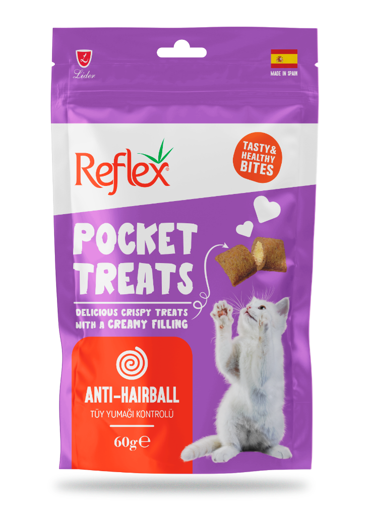 Reflex Pocket Treats Anti-Hairball Tüy Yumağı Kontrolü Kedi Ödül Maması 60gr Reflex Pocket Treats, içeriğindeki özel formülü sayesinde tüy topaklarını kontrol eden bir yapıya sahiptir. Kediler için özel olarak formüle edilmiştir. Analiz Tablosu Ham Protein %29 Ham Yağ %20 Ham Lif %3,6 Ham Kül %6 İçerik Bitkisel Kökenli Türevler Et ve Hayvansal Türevler Tahıllar (%0,5 malt) Sıvı ve Katı Yağlar Bitkisel Protein Özütleri Mineraller Besin Katkı Maddeleri Vitamin A 6.000 IU/kg Vitamin D3 400 IU/kg Vitamin E 100 mg/kg, Taurin 1.000 mg Kullanım Talimatı Oda sıcaklığında saklayınız.