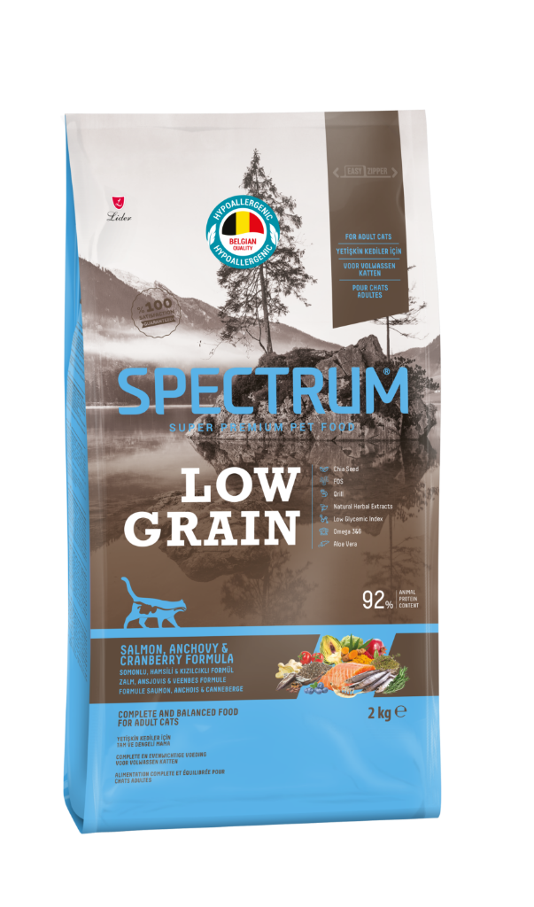 Spectrum Düşük Tahıllı Somonlu, Hamsili ve Kızılcıklı Kısırlaştırılmış Kedi Maması, kısırlaştırılmış kedilerin daha düşük enerji ihtiyacını karşılamak ve sağlıklı bir kiloyu korumalarını sağlamak için özel olarak formüle edilmiştir. Somon ve hamsi proteinleriyle kas gelişimini desteklerken, düşük kalori yapısıyla kilo kontrolüne yardımcı olur.